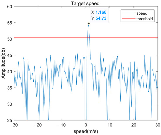 Through the method above, we can effectively remove the clutter in the detection area and effectively improve the signal-to-noise ratio. The moving target is detected under the same simulation conditions as Figure 5 and Figure 6, and the detection results are shown in Figure 8 and Figure 9. It can be seen from Figure 8 that the target signal that cannot be detected in Figure 5 is very obvious, and the peak value of the signal exceeds the threshold by about 7 dB.