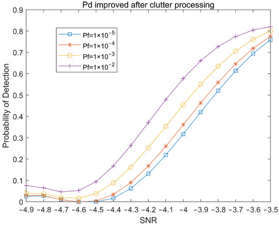 Figure 10 shows the magnitude of the improvement of the detection performance for tangentially moving targets after the signal is cluttered. After the clutter processing, when the signal-to-noise ratio is −4 dB, the target detection performance is improved by nearly −3 dB. The results prove that clutter processing effectively improves the detection performance of the target characteristic signals under the conditions of a low signal-to-noise ratio and strong clutter interference.