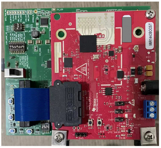 In the realistic experimental scene, the test equipment adopts IWR1443 millimeter-wave radar, which is a commercial radar system of Texas Instruments, and adopts DCA1000 for real-time data acquisition, as shown in Figure 11. IWR1443 millimeter-wave radar has three transmit channels (one of which is an elevation antenna) and four receive channels with spacing, which can form a standard virtual array with eight receive channels for target azimuth estimation. In order to simulate strong static clutter interference, the experiment sets a static corner reflector in the radar detection area, and then, pedestrians pass through the radar detection area at a constant speed from outside the radar detection area along the position perpendicular to the radar line of sight of about 10 m. The radar parameters used for data acquisition are shown in Table 2.