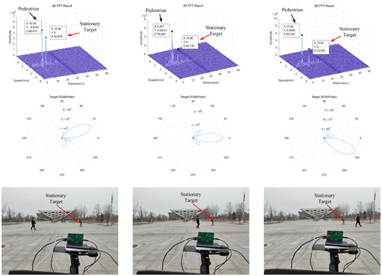 Figure 13 shows the processing results of moving targets. The system estimates that the speed of the slow tangential moving targets is about 1.2 m/s, which is close to the real speed of the target (about 1.5 m/s, obtained by the distance of the target moving in a certain time).