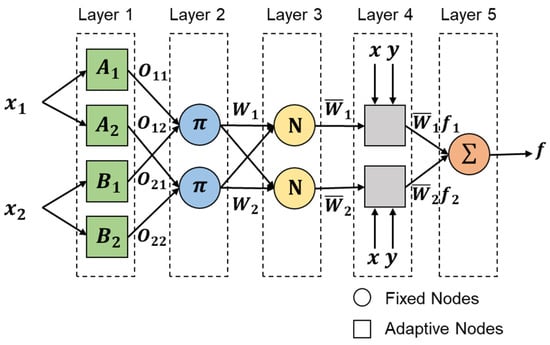 The architecture of ANFIS is shown in Figure 2. Five layers are used to construct this model. For simplicity, we assume the fuzzy inference system under consideration has two inputs and and one output . Suppose that the rule base contains two fuzzy if-then rules of Takagi and Sugeno-type [].