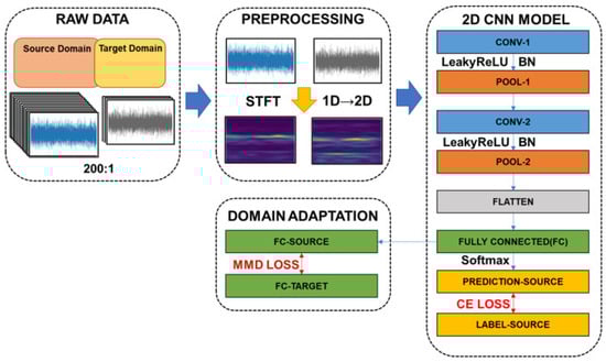 According to the results of [], STFT has great potential to preprocess vibration signals and is beneficial to the follow-up CNN training. In this study, the architecture of the proposed CNN model is shown in Figure 3. At first, the vibrational signals (raw data) are transformed into STFT time-frequency spectra, the raw vibrational signal is transferred into image. Then, a CNN model with seven layers including one input layer, two convolution layers, two pooling layers, one fully connected layer, and one output layer, is trained to classify the bearing conditions. The detailed network structure of the CNN is introduced in Table 1. Finally, a domain adaptation model is trained to reduce the distribution distance between two domains (target and source). Please note that a large imbalanced data ratio between source and target sets is considered for the manufacturing site. In addition, the cross-entropy (CE) loss is utilized for the training of source data and the MMD loss is adopted to minimize the distribution difference.