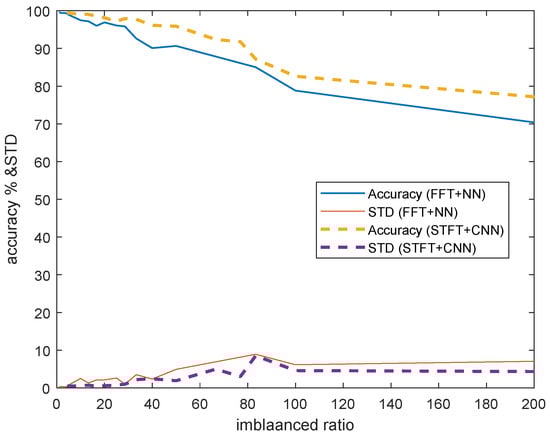- The comparison results of the accuracy and standard deviation (STD) of ten independent trials are shown in Figure 5: solid lines denote the results of FFT + NN; and dashed-lines denotes the results of STFT + CNN. Obviously, it can be observed that the proposed method outperforms (higher accuracy and smaller STD) the traditional method for imbalanced cross-domain data.