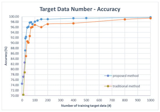 - When the number of target domain data reaches 26, the accuracy of the proposed method will be over 90%, whereas a traditional method needs 40 target data to achieve a prediction accuracy of 90%. When the number of target domain data reaches 150, the accuracy will be over 99% for our proposed method, while a traditional method needs 1000 data to achieve over 99% accuracy.