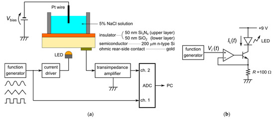 The setup for the LAPS measurement that we used in this study is shown in Figure 1a. The LAPS sensor plate was composed of n-type Si, with a resistivity of 1–10 Ωcm, a size of 35 mm 35 mm, and a thickness of 200 μm. We formed a 50 nm thick thermal oxide and deposited a 50 nm thick Si3N4, in this order, onto the front surface, and evaporated an Ohmic rear-side contact near the edge of the back surface.