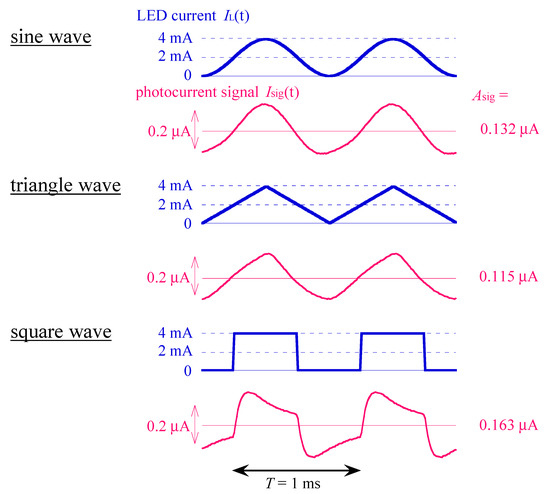 First, we investigated the effect of the shape of on the value of . We tested three different waveforms, namely, a sine wave, a triangle wave, and a square wave, which are plotted in blue in Figure 2. All three waveforms had the same fundamental frequency (1 kHz) and the same average LED current ( of 2 mA). The maximum and the minimum current values were 4 and 0 mA, respectively. The resultant photocurrent signals () for each waveform are plotted in red. Note that the photocurrent signal () has no DC component because the DC current is blocked by the insulator layer.