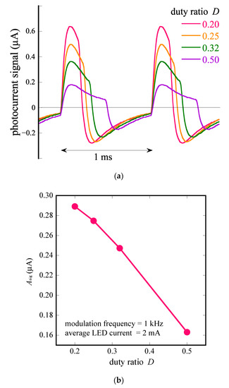 In Figure 4b, we plot the amplitude of the fundamental frequency of the photocurrent signal () as a function of the duty ratio (). As we expected, the amplitude () increased as reduced. The value of at 0.20 was 0.289 μA, which was slightly larger than twice the value for a sine wave (0.132 μA). A further reduction in would result in even taller pulses, which, however, does not contribute to a substantial increase in . However, a higher peak value demands more allowance for both the output current of the LED current driver and the input range of the trans-impedance amplifier. Therefore, from a practical point of view, a duty ratio of 0.20 is an appropriate compromise.