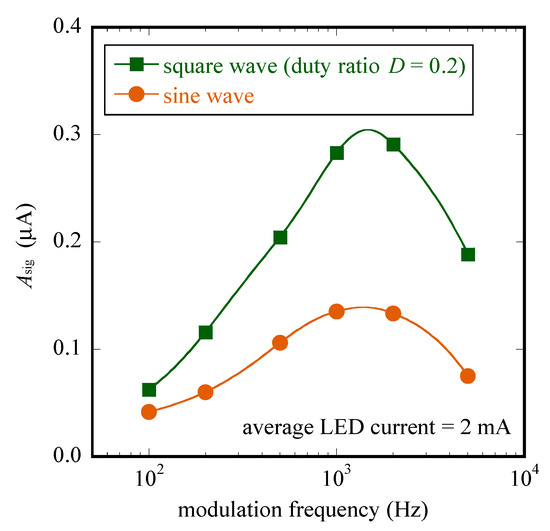 Finally, Figure 5 compares the values of we obtained with a sine wave and a square wave () of illumination in a typical frequency range of a LAPS, 100 to 5000 Hz. The overall shape of the frequency dependence is typical for a conventional LAPS sensor plate; the photocurrent had a peak in the kHz region and decayed at both lower and higher frequencies [10,11,19]. Except for the lowest frequency, the photocurrent generated by a square wave () of illumination was always larger than a sine wave by a factor of about two. This result showed that the correct choice of the modulation frequency, as well as the waveform, results in a much higher photocurrent signal, which is advantageous for high-precision measurement with a LAPS sensor plate.