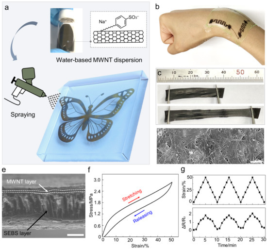 The morphology and characteristics of MWNT/SEBS bilayer-based electrochemical harvester. (a) Schematic illustration of fabrication process based on the sequential spray-coating method. A MWNT/SEBS bilayer was formed by sequentially coating MWNT dispersion and SEBS solution. (Inset) The optical image of MWNT dispersion with sodium dodecylbenzene sulfonate; (b) The optical image of the patterned MWTN/SEBS bilayer was attached to the human wrist to demonstrate the utility of the wearable device; (c) The optical image of MWNT/SEBS bilayer for 0% and 50% strain; (d) SEM image of MWNT/SEBS bilayer in which MWNT are physically entangled with each other (scale bar: 500 nm); (e) The cross-sectional SEM image of MWNT/SEBS bilayer (scale bar: 10 um); (f) Strain–stress curve of MWNT/SEBS bilayer stretched to 50% strain; (g) The strain and resistance ratio value of the MWNT/SEBS bilayer while reversibly stretching to 50% strain.
