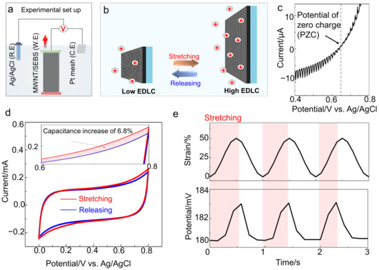 When the bilayer was stretched in the electrolyte, the electrical energy was generated from the mechanical stimulation of a SECH. The electrochemical cell was set up to verify the performance of the energy harvester (Figure 2a and Figure S5). The cell was composed of a working electrode of MWNT/SEBS bilayer, the counter electrode of platinum (Pt) mesh, and the reference electrode of Ag/AgCl. All of the components were immersed in the aqueous electrolyte of saline for the biomedical system. When the bilayer was immersed in the electrolyte, a chemical potential difference existed between the electrode surface and surrounding electrolyte [18,25]. Simultaneously, the MWNTs formed an EDLC with the ion of the electrolyte. The active surface area participating in the electrochemical reaction was enhanced because the bilayer was stretched to 50% (Figure 2b), increasing the capacitance by 6.8% from 11.1 mF/cm2 to 11.8 mF/cm2 (Figure 2d).