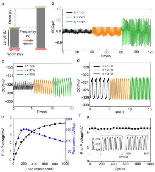 We analyzed the voltage generation performance of the SECH, according to the applied strain (Figure 3c). The open-circuit voltage was measured during a 1-Hz sinusoidal stretch in saline. The increment of the applied strain on the bilayer from 10% to 50% increased the peak-to-peak voltage from 4 mV to 8 mV. Furthermore, the performance remained approximately constant with the frequency, electrolyte concentration, and temperature (Figure 3d and Figures S7 and S8). The generated electrical energy with external load is shown in Figure 3e. The peak-to-peak voltage and power were acquired with load resistance during the 1-Hz sinusoidal stretch to 50% strain in saline. The peak-to-peak voltage was increased with external load resistance, and the peak power of 156 µW/kg (standard deviation value of 13.27 with five different SECH samples) was maximized at a load resistance of 200 Ω (Figure 3e and Figure S9). At this time, the maximum area peak power is 1.02 mW/m2, which is similar to the performance of the existing film-type electrochemical energy harvester (1.28 mW/m2) [17]. The existing piezoelectric and triboelectric nanogenerators have high impedance matching values (above 100 MΩ) [10,11], making it difficult to integrate them into an electric circuit with another electric device. However, our device demonstrated a significant reduction in the internal resistance value to provide a high advantage as an electronic device. The performance stability during the repeated stretching/releasing cycle was significant. Figure 3f shows that the peak power was maintained for more than 1000 cycles during the 1-Hz sinusoidal stretch to 40% strain in saline. The open-circuit voltage remained approximately constant at 6 mV during the 1000 cycles; moreover, the voltage retention was changed below 3% (Figure S10, Supplementary Materials).