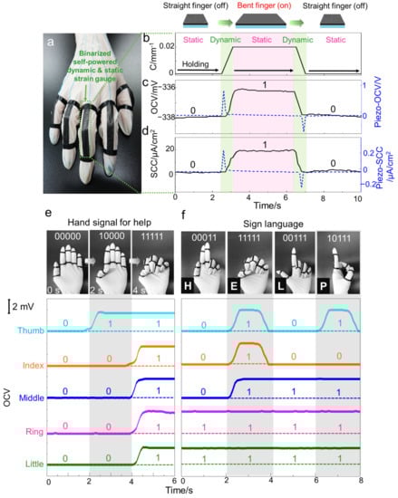 The binarized self-powered strain gauge for the dynamic and static human-motion monitoring system. (a) The optical image of wearable self-powered strain gauge using SECH; (b) The curvature; (c) open-circuit voltage; and (d) short-circuit current of SECH and commercial piezoelectric film when the finger was bent. The open-circuit voltage versus time with change of hand configuration for (e) hand signal for help and (f) sign language. (Inset) the photograph of hand configuration with a binary number.