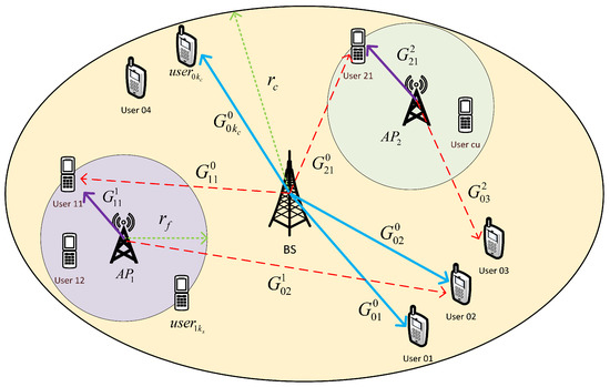 The wireless channel between each transmitter–receiver couple is modeled through a distance-dependent path loss and a random small-scale fading, which is assumed to be constant along the set of consecutive slots of a frame. By taking the downlink as a reference case, the power received by the user u of cell c, from the base station or access point b, on the OFDM subchannel s is given by , where represents the average channel gain and represents the random fading gain on the subchannel s. The notation scheme is illustrated in Figure 3. The average channel gain is the multiplicative inverse of the path-loss, which is modeled [15] as follows: