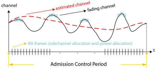 We use a dynamic radio resource management due to the time-varying nature of the wireless channel, as sketched in Figure 2. This is is based on a radio resource allocation (RA) algorithm that efficiently allocates RBs and controls the power, frame by frame, and an admission control (AC) algorithm that determines which users can be served by the network in a long-term period under QoS requirements. The RA algorithm sees short-term time-varying fading conditions, even in the frequency domain. The AC algorithm sees average channel conditions in its operating period. It admits the users that have the best channel conditions in the long-term.