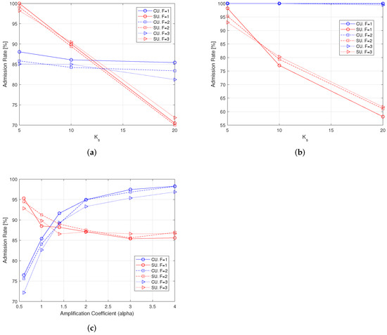 We first investigate the behavior of AC by looking at the admission rate for both CUs and SUs, which is shown in the plots of Figure 4. The AC outcomes determine the operation setup (load) of the network, which also influences the behavior of the RA.
