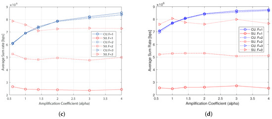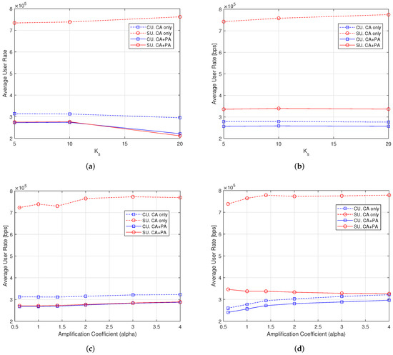 From Figure 5a,b, we note that the average rate is almost independent of the number of candidate SUs, which means that the RA algorithm is able to provide the required QoS to the set of users carefully admitted by the AC algorithm. Moreover, we note that the CE-aware algorithm is able to equalize the rates of CUs and SUs, whereas the CE-unaware algorithm still works, but the SU rate is 20% larger than the CU rate. From Figure 5c,d, we note that the achieved average rate increases when the power of the pilot symbols increases for both CUs and SUs with the CE-aware algorithms. In this case, the positive effect of channel estimation error reduction overcomes the power efficiency penalty. With the CE-unaware algorithms, the SU rate decreases when the CU rate increases, but more power on the pilots makes a noticeable contribution to equalizing the rates.