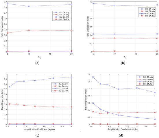Rate dispersion index with F = 1, = 30 users, 100 iterations. (a) Varying , = 1, CE-aware; (b) varying , = 1, CE-unaware; (c) varying , = 10, CE-aware; (d) varying , = 10, CE-unaware.