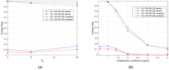The outage rate is the simulative evaluation of the probability that the rate provided to any user is less than the requirement, i.e., , , which is an important metric. In addition, the results for this metric confirm the previous findings and the good behavior of CE-aware algorithms with respect to CE-unaware algorithms. We can see in Figure 7a,b that the outage rate is below 0.2 and quite balanced among CUs and SUs—slightly larger for CUs. It goes to 0 when the power of pilot symbols increases. The outage rate for CUs raises to nearly 1 in Figure 7a when a CE-unaware RA scheme is used. It is also quite sensitive to the power allocated to pilots, as shown in Figure 7b, and goes below 0.2 when , approaching 0 in the CE-aware scheme.