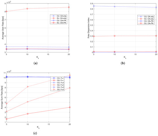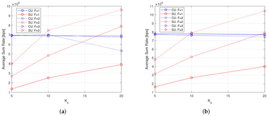 The specific details of Algorithm 1 are as follows. In step 2.a, one subchannel is allocated to each CU by selecting the subchannel with the best channel gain in the set of still unassigned channels. In step 2.b, the remaining unassigned channels are allocated according to the rule that, in each turn, the user with the smallest proportional rate gets the priority to choose their best subchannel. In step 3.a, one subchannel is allocated to each SU in sharing mode by selecting the subchannel with the best rate–fairness tradeoff in the set of still unassigned channels. The rate–fairness tradeoff due to the allocation of subchannel s to SU is evaluated with the rate metric: