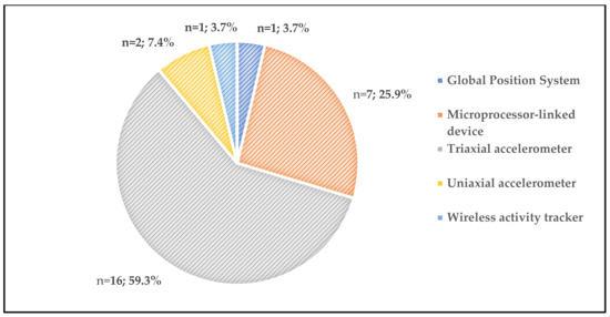 Figure 4 illustrates proportion of sensors. The most commonly used sensors were triaxial accelerometers (n = 16, 61.5%) [19,20,21,22,23,31,32,33,34,35,36,37,38,39,40,42], followed by microprocessor linked devices which were used in seven studies (26.9%) [24,25,26,27,28,41,43]. Furthermore, two (7.7%) studies conducted assessments with uniaxial accelerometers [29,30]. Two studies assessed daily physical activity with a wireless activity tracker (n = 1, 3.8%) [44] and a Global Position System (n = 1, 3.8%) [33].