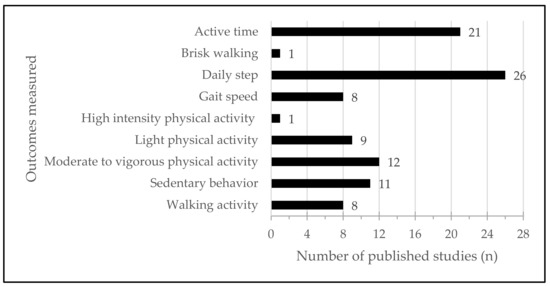 Figure 5 allows a better understanding of the outcomes measured. Sedentary behavior was explored in 11 studies (42.3%) [19,21,23,26,31,32,33,34,35,39,40], and measured in min·day−1 or in min·hours−1 of wear time. Finally, active time is an outcome of interest due to the important number of articles which evaluated active time (n = 21, 80.8%) [19,20,21,22,23,24,26,27,29,30,31,32,33,34,35,36,37,39,40,42,44]. Active time was identified by: active time, activity counts, walking activity, light physical activity, moderate to vigorous physical activity, high intensity physical activity, or brisk walking.