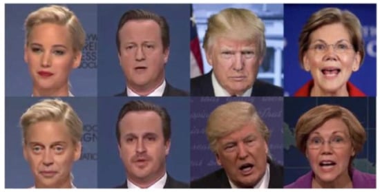 Figure 3 shows the original and fake faces generated by deepfake algorithms. The top row shows the original faces whereas the bottom row shows the corresponding fake faces generated by deepfake algorithms. It shows a good example of the potential of deepfake technology to generate genuine-looking pictures.