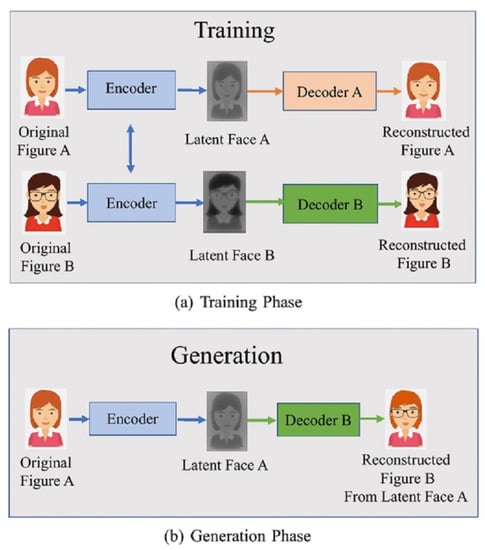FakeApp is an app built by a Reddit user to generate deepfakes by utilizing an autoencoder–decoder pairing structure [38,39]. By using this technique, face pictures are decoded using an autoencoder and a decoder. Encoding and decoding pairs are required to change faces between input and output pictures. Each pair is trained on a different image collection and the encoder parameters are shared between the two networks. As a result, two pairs of encoders share the same network. Faces are often similar in terms of eye, nose, and mouth locations and, thus, this technique makes it very easy for a common encoder to learn the similarities between two sets of face pictures. Figure 4 demonstrates a deep creation process, in which the characteristics of face A are linked to decoder B to recreate face B from the original face A. It depicts the use of two pairs of encoder–decoders in a deep creational model. For the training process, two networks utilize the same encoder and various decoders (Figure 4a). The standard encoder encodes an image of face A and decoder B to generate a deepfake image (Figure 4b).