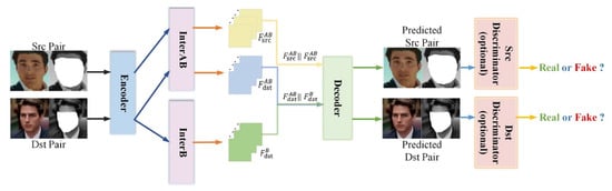 DeepFaceLab [41] was introduced to overcome the limitations of obscure workflow and poor performance which are commonly found in deepfake generating models. It is an enhanced framework used for face-swapping [41] as shown in Figure 5. It uses a conversion phase that consists of an ‘encoder’ and ‘destination decoder’ with an ’inter’ layer between them, and an ‘alignment’ layer at the end. The proposed approach LIAE is shown in Figure 6. For feature extraction, heat map-based facial landmark algorithm 2DFAN [42] is used while face segmentation is achieved by a fine-grained face segmentation network, TernausNet [43].