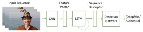 An automated deepfake video detection pipeline based on temporal awareness is proposed in [75], as shown in Figure 8. For this purpose, the study proposes a two-stage analysis where the first stage involves using a CNN to extract characteristics at the frame level, followed by a recurrent neural network (RNN) that can detect temporal irregularities produced during the face-swapping procedure. The study created a dataset of 600 videos, half of which are gathered from a variety of video-hosting websites, while the other 300 are random selections from the HOHA dataset. With the use of sub-sequences of frames, the performance of the proposed model is evaluated in terms of detection accuracy. The results show that from the selected frames, CNN-LSTM achieves the highest accuracy of 97.1% from 40 and 80 frames.