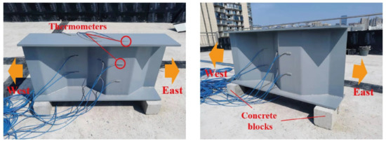 The experimental work was carried out using a steel beam with a corrugated web which was assembled on the campus of Central South University at Latitude: 28°8′23″ N and Longitude: 112°59′10″ E, as shown in Figure 1. The experimental site was located on the rooftop of a six-story lab and surrounding buildings had no sheltering effects on the steel beam specimen. The longitudinal axis of the experimental specimen was placed in the East–West direction. The south side of the specimen was exposed to the sunlight during the daytime, while the north side of the specimen barely received solar radiation.