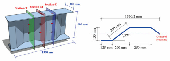 The experimental steel beam was fabricated with two 15 mm thick steel plates and one 9 mm thick corrugated steel plate. The detailed dimensions of the steel beam are provided in Figure 2. The length, width and height of the experimental steel beam were 1350 mm, 300 mm, and 600 mm, respectively, whereas the wave length, wave height, and bending angle of the corrugated steel web were 900 mm, 150 mm, and 37°, respectively.