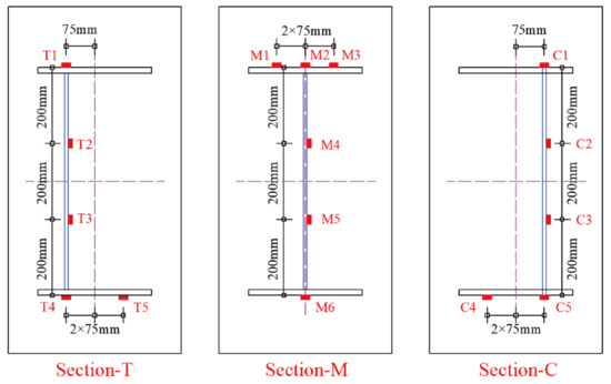 A total of 16 PT1000 platinum resistance thermometers were installed on the surfaces of the steel beam for temperature measurement. These thermometers were arranged at three different cross-sections, as shown in Figure 2. The cross-sections at the crest and trough of the steel beam are, respectively, denoted as Section-C and Section-T, while the middle cross-section of the steel beam is denoted as Section-M. The detailed positions of these thermometers and their serial numbers are provided in Figure 3.