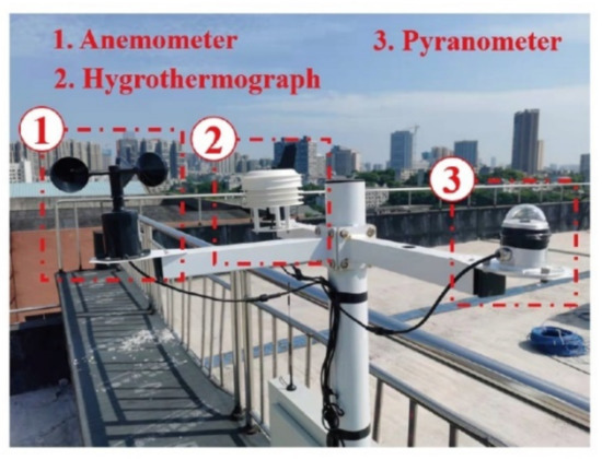 The experimental scheme also included the measurement of surrounding climatic data. A small weather station was assembled at the experimental site for climatic data acquisition, as displayed in Figure 4. The anemometer, hygrothermograph, and pyranometer were applied to measure the wind speed, air temperature, and solar radiation intensity, respectively. The temperature of the steel beam and its surrounding climatic data 2343 synchronously recorded every 15 min from 17 August 2021 to 30 September 2021.