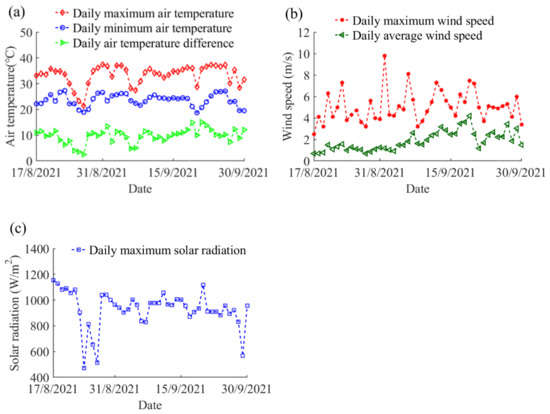 The wind speed contributes to a significant influence on the convection cooling process. The daily maximum and average wind speed along the complete experimental period are given in Figure 5b. The daily average wind speed ranged from 0.7 m/s to 4.2 m/s, while the highest wind speed reached 9.8 m/s on 1 September 2021. The solar radiation intensity dominates the heat flux from global solar radiation on the boundary surfaces. Figure 5c shows the daily maximum solar radiation intensity along the measurement peri-od. On sunny days, the daily maximum solar radiation intensity generally ranged from 900 to 1100 W/m2. The highest solar radiation intensity of 1155 W/m2 occurred on 17 August 2021.