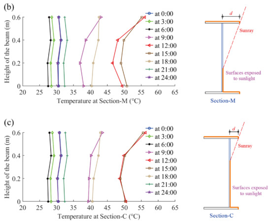 In this section, the steel beam’s vertical temperature variation in a typical day is studied in detailed. The typical day was determined to be 31 August 2021 on which the highest sample temperature was recorded. The vertical temperature distributions at different times on the typical day are demonstrated in Figure 6. The thermal loading conditions on the steel beam’s surfaces are different among three cross-sections. The steel web surfaces at Section-T are shaded by the top flange in the daytime, while the steel web surfaces at Section-M and Section-C are directly exposed to the sunlight. This phenomenon brings about different temperature distributions among three sections. The magnitude of the steel web’s temperature in Section-C is the maximum, followed by that in Section m and Section-T, respectively. The maximum vertical temperature gradients at Section-T, Section-M, and Section-C are 10.2 °C, 10.1 °C, and 7.9 °C, respectively.
