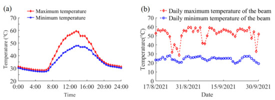 The steel beam’s maximum and minimum temperatures on the typical day are shown in Figure 8a. The temperature of the steel beam increased rapidly after sunrise and reached the peak value 59.4 °C at 13:30, while the minimum temperature of the steel beam was 27.4 °C, which was observed at nighttime. Figure 8b illustrates the recorded daily maximum and minimum temperatures during the complete experimental period. It can be observed that the variation trend of the daily maximum temperature is consistent with the daily maximum solar radiation. While the daily minimum temperature has the similar variation with the daily minimum air temperature. The recorded daily maximum temperature of the steel beam reached 59.4 °C on 31 August 2021, while the measured minimum temperature dropped to as low as 19.2 °C on 20 September 2021.