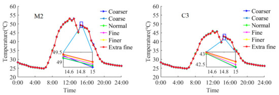 The temperature variation of M2 and C3 for different mesh sizes.