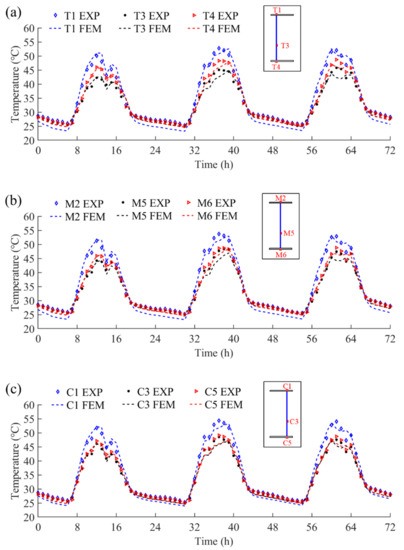 Three-day experimental temperatures (from 13 September 2021 to 15 September 2021) were used to validate the FE model. These days were continuous sunny days. Thus, the steel beam’s temperature distribution characteristics should not be affected by weather variations. Measurement points at Section-T (T1, T3, and T4), Section-M (M2, M5, and M6), and Section-C (C1, C3, and C5) were selected to compare the experimental and the simulated temperatures, as illustrated in Figure 10. The EXP and FEM in the figures stand for the experimental temperatures and the finite element simulated temperatures, respectively. It can be observed that the variations and the magnitudes of the finite element simulated temperatures match well with the experimental temperatures.