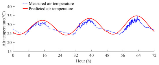 where Tmax and Tmin are the daily maximum and minimum air temperatures, respectively. Figure 11 shows the air temperatures predicted using Equation (11) and the measured air temperatures from 13 September 2021 to 15 September 2021. It can be observed that the predicted air temperatures are in good agreement with the measured air temperatures. Thus, the Kreith and Kreider equation presents sufficient accuracy for describing the variations in air temperature.