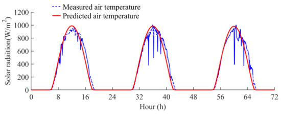 where ka represents the relative atmospheric pressure, and tu represents the Linke turbidity coefficient, which is an indicator of atmospheric opacity. The predicted solar radiation was compared with the measured solar radiation from 13 September 2021 to 15 September 2021, as presented in Figure 12. As is presented in the figure, the predicted solar radiation agrees well with the measured solar radiation. Thus, these empirical equations were adopted to predict the time-varying solar radiation.