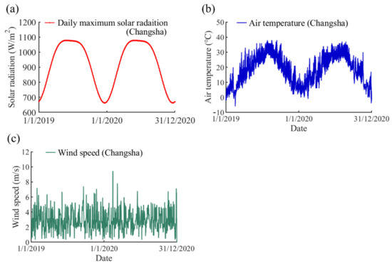 The long-term climatic parameter variation in Changsha: (a) daily maximum solar radiation; (b) air temperature; and (c) wind speed.