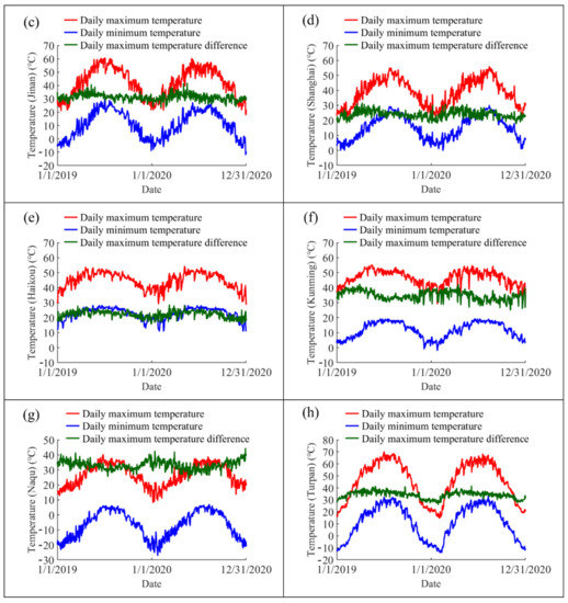 Daily maximum temperatures, daily minimum temperatures, and daily maximum temperature differences of steel beams in different cities: (a) Harbin; (b) Changsha; (c) Jinan; (d) Shanghai; (e) Haikou; (f) Kunming; (g) Naqu; and (h) Turpan.