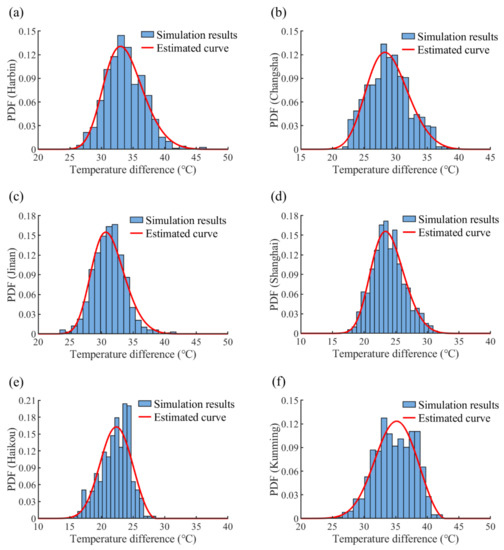 - The representative values of steel beams’ daily temperature difference with a 50-year return period were determined with an extreme value analysis. All the daily temperature differences in relation to the eight cities studied fit well with the Weibull distribution. The representative values of steel beams’ daily temperature differences in Harbin, Changsha, Jinan, Shanghai, Haikou, Kunming, Naqu, and Turpan are 46.9 °C, 40.8 °C, 41.9 °C, 33.3 °C, 28.8 °C, 42.6 °C, 44.4 °C, and 41.7 °C, respectively.