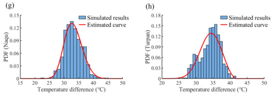 Frequency histogram and fitted PDF curves regarding different cities: (a) Harbin; (b) Changsha; (c) Jinan; (d) Shanghai; (e) Haikou; (f) Kunming; (g) Naqu; and (h) Turpan.