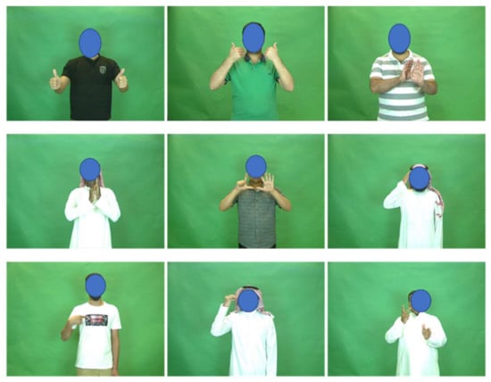 The collection of the KSU-SSL dataset is still in progress. It is collected by the Center of smart robotic research at King Saud University. It consists of 293 classes from the daily life sign language gestures in the Kingdom of Saudi Arabia (KSA). The KSA sign languages have several dialects; however, we choose the one which is recommended by the Saudi Association for Hearing Impairment. It can be noted that some deaf people sometimes do not adhere to a specific dialect. In the database, we do not include such deaf people. Most of the gestures were selected from the medical field for their importance and high demand by deaf people. This dataset is recorded in a well-controlled environment with suitable lighting conditions and uniform background color. The recording studio setup utilizes three frontal imaging devices: a high-speed RGB camera, an IR camera, and a mobile camera. The recorded gestures are performed by deaf, hard-of-hearing, sign language experts, and non-deaf people. The recorded gestures are also verified by sign language experts. Each participant is invited to perform each gesture five times. The last repetition is recorded with colored hands. Until the time of conducting this study, 30 participants have completely or partially recorded the dataset gestures. In this study, only the RGB camera videos without colored hands are involved. Sample frames from the KSU-SSL dataset are illustrated in Figure 1.