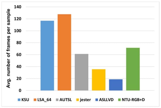 The other datasets used for evaluation are the AUTSL dataset [41], the Argentinean sign language dataset (LSA64) [42], the American sign language lexicon video dataset (ASLLVD) [43], and Jester [44]. Some explanatory statistics of these datasets are summarized in Table 1. Figure 2 also illustrates how the average number of frames per video varies in different datasets.