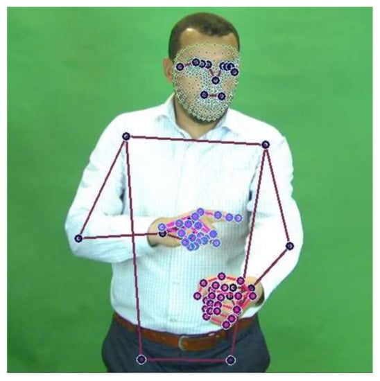 MediaPipe is a recent framework presented by Google. It offers cross-platform, machine learning solutions for streaming media. It enables the live perception of human pose, hand tracking, and face landmarks on mobile devices and in real time [45]. Each solution enables a wide range of modern life applications such as augmented reality, fitness, and sports analysis. MediaPipe can detect and track 33 pose landmarks, 21 landmarks per hand and 468 face landmarks in the three mentioned solutions, respectively. Furthermore, MediaPipe provides a holistic solution, which integrates models for the pose, the hands, and the face components. The holistic solution can accurately estimate and track 543 landmarks in total. Each estimated landmark is represented in x, y, and z coordinates. Figure 3 depicts some of the estimated landmarks in a sample frame from the KSU-SSL dataset.