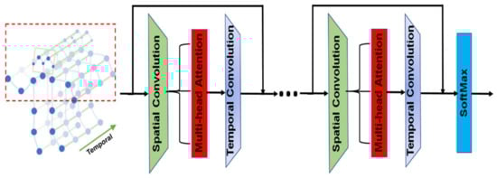 where is the output embedding of nodes, , and the shared weight matrix for node-wise feature transformation is formed by stacking the weight vectors of multiple kernels. The input nodes’ embedding is also represented by a tensor of the form , where is the number of channels, is the number of nodes per frame, and is the number of frames. The convolution operation in Equation (1) performs a standard 2D convolution on each frame separately and then multiplies the resulted tensors with the normalized adjacency matrix . Another 2D convolution was then performed along the temporal dimension of the output tensors to model the dependency between the consecutive frames. The output layer utilized the categorical cross-entropy function for loss optimization.