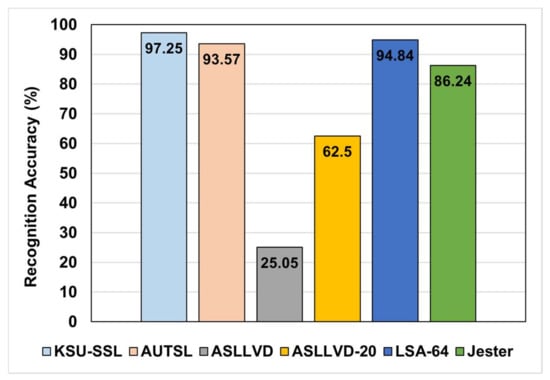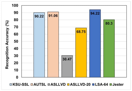 After that, the optimized architecture was evaluated on the other datasets. The results are illustrated in Figure 8. It is clear from these results that the performance of the proposed architecture was significantly enhanced by the multi-head attention layer on the KSU-SSL, AUTSL, and Jester datasets. These three datasets are comprehensive in terms of the number of classes and the number of samples in each training and validation split, as shown in Table 1. The comprehensiveness of these datasets benefited from the increased number of parameters in the multi-head attention layer. The multi-head attention parameters generalized the architecture and enabled it to reflect the large variety in sign configuration at the frame level.
