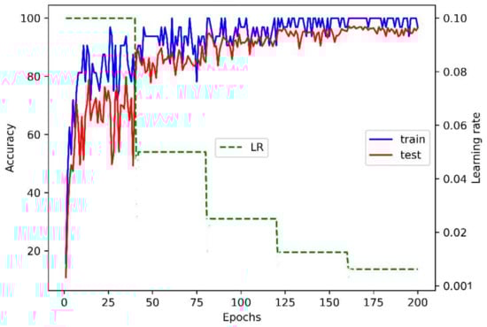 A fixed configuration was used to conduct the training, where mini-batch gradient descent was utilized with a batch size of 32 samples and an adapted learning rate. The initial value of the learning rate was set to 0.1 with an updating step size of 40 epochs. The learning rate was decayed after each step size according to Equation (7), which enables a smoother fine tuning for the trainable parameters with the advancement in training time.